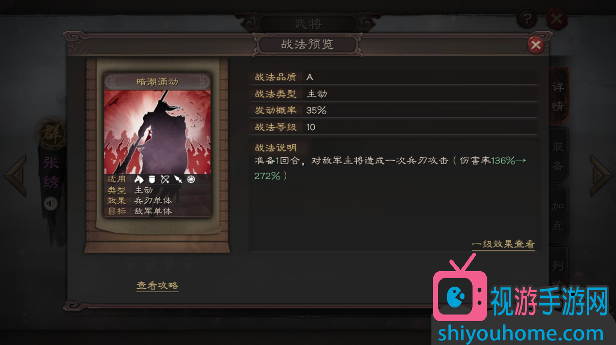 暗潮涌动,单体战法,可直接对敌方主将造成巨额伤害,这有点像于万军丛中取敌将首级一样,属于爆头战法。该战法有一个好处就是能够快速解决敌方主将,只要敌方主将被杀死,那么这场对决就已经胜利了。如果想要增加斩首几率,可以跟张梁组成双爆头战法。这样在击杀敌方主将的时候,几率就会大大提升很多。