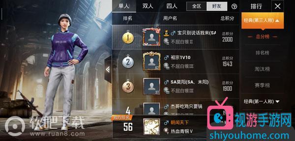 第二步,查看单人榜,在单人排行榜中有单排、双排、四排等好友和全区排行数据;