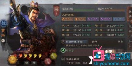 曹仁: 6御, 50级面板统率204, 武力149, 智力113, 速度61。 4围属性达到527。