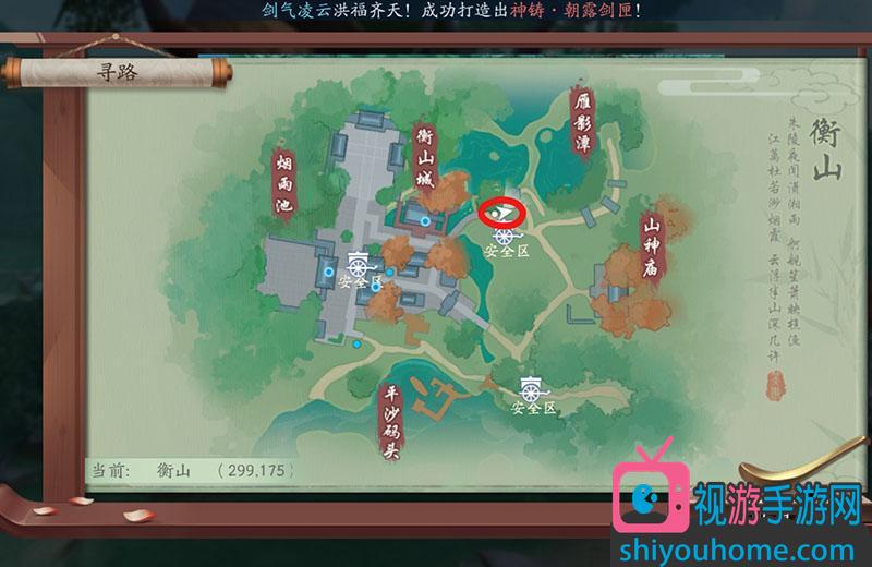 首先,小伙伴们请打开衡山大地图,在下图中红圈标出来的位置,就能找到莫大啦,其具体位置坐标是衡山(299,175);
