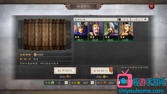 三星以上的武将,抽到相同的也别急着全升星,起码要留一张,因为武将自身的战法可以传承给其他武将,传承需要消耗武将卡。传承战法后还需要演练100%才能给其他武将使用,这也要消耗同等级的武将卡,因此别急着先升级。当然,氪金玩家请无视这一条。