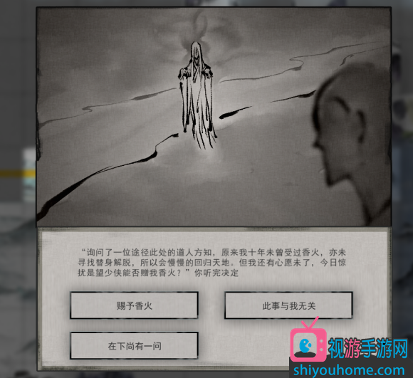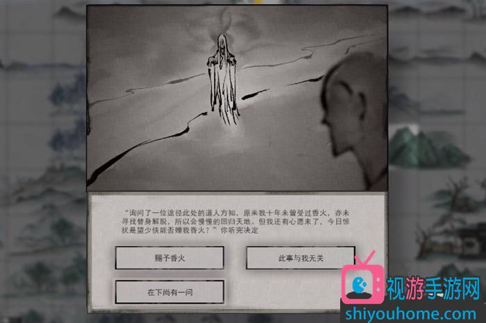剩下的选项就是“不归河 莫非词河有什么古怪”。选择这个选项之后,会衍生出接下来的剧情,修炼时有一个白衣女子莫雪前来,莫雪原来是被水鬼拉下水害死,要求玩家赠与香火,这里也就衍生出另外三个选择了。