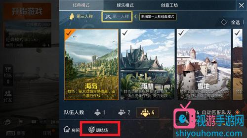 点击进去可以看到这里可以切换地图,选择不同的地图,在下方还可以点击训练场和创建房间,这个就是训练场的位置直接进去就可以了。