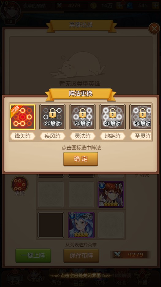 1、可根据实际上阵的英雄职业决定例如上阵了2个肉盾型英雄,推荐使用圣灵阵,从而加强我方其他英雄的保护
